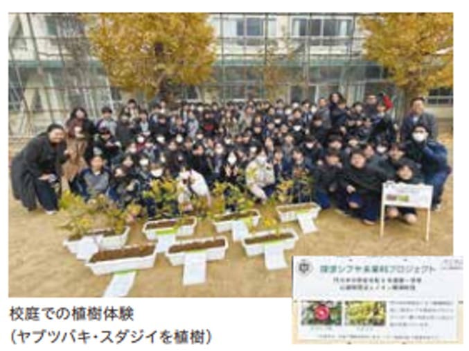 渋谷区教育委員会と連携し、代々木中学校1年生118人に対し、環境教育の出前授業を4回 実施しました。気候変動、生物多様性、里山、SDGsを各回のテーマとし、当財団の取り組み 紹介を交えて授業を行いました。校庭での植樹体験や個人行動宣言の作成を通じて、生徒 の行動変容を促しました。