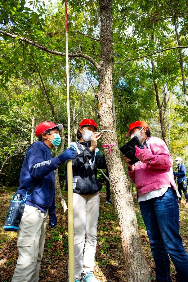 綾町および南島原市のイオンの森で地元の小中学生が、樹高と幹の太さを計り、樹木の炭素蓄積量を推定することにより、