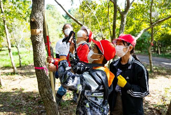 綾町および南島原市のイオンの森で地元の小中学生が、樹高と幹の太さを計り、樹木の炭素蓄積量を推定することにより、