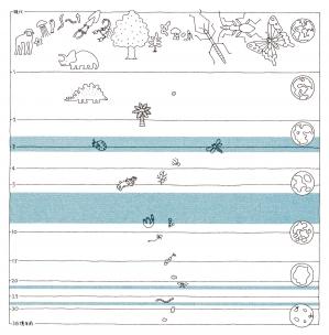 I already explained that living things are diverse. This is “biodiversity.” Recently, “biodiversity” became an emerging issue as part of environmental problems as interest in the environment has increased. Now, many people are conscious that it is important for living things to be diverse and we should not take actions that may damage living things. But unfortunately, we still think that humans are special and different from other living thing, and conserve biodiversity from outside – don’t we? This idea is expressed in the following words: “be earth-friendly.” But, as shown in the scroll, “humans are part of nature and exist as a type of diverse living thing.” The earth is the existence that holds us and lets us live. We should live so that the earth is friendly to us. The power of the earth is enormous and we suffer from earthquakes, typhoons, explosions, tornadoes and so on. The earth is not malicious – these events only are a manifestation of “the power of the earth.” But they are terrifying and sometimes threatens our lives. I strongly realized the power of the earth when Japan was hit by the Great East Japan Earthquake in 2011. In addition, the damage became greater and more serious due to the accidents at the nuclear power plants. Science and technology representing the modern society brought us new disasters. This experience led me to think about what is important when we live on the moving earth as living things. The “New Biohistory Scroll” is drawn based on such movement of the earth (Figure 2). The blue lines show extinction.