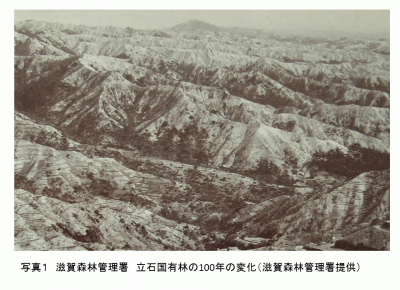 明治維新以降は化石燃料の利用が始まるが、国内木材資源の利用も続き、明治から戦後にかけて、日本の森は荒廃し、一部は禿山に近い状態であった(写真1)。禿山で浸食された大量の土砂は川を埋めつくし、川底が上昇し、洪水や土砂災害も頻発した。その後、1950 年代から1970 年代にかけて高度経済成長期を迎え、土地利用の集約化が進んだ。戦後の経済復興を支えるため、木材需要は急増し、これに対応するために、政府は“拡大造林政策”を推進した。拡大造林とは、広葉樹主体の天然林を伐採して、針葉樹中心の人工林に置き換える政策であり、日本全体で約1000万haにのぼる人工林がこの時期を中心に植林された。しかし、その後、安価な外材輸入が始まり、結果的に日本の人工林は温存され、輸入材に頼る体質(自給率約25%)は今も変わっていない。