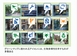 私が気に入っているアイコンのいくつかは、京都にある美しい仏教寺院、法然院でのワークショップでデザインされたものだ。「特別な木(Special Tree)」というアイコンのコンセプトは、まさしく法然院の庭から得られたもので、そこでは3色の聖なる椿が花開いていた。風に舞う落ち葉は「コンポスト(Composting)」のシンボルとなり、庭でスケッチした小鳥も「野鳥・生物観察(Wildlife Watching Site)」を表している。それは、この世界に命をもたらしながら、すべてのグリーンマップにも活気を添えている。海岸、両生類、海洋、虫類の生息地を表すシンボルは、多くのグリーンマップに使われており、環境に対する共通の総合的見解を示している。「自然食品店/地産品(Organic/Local food)」は、多くの人にとって持続可能な発想への「足がかり」となる。また、「産地直売/市場(Farmers Market)」のアイコンは、地域に息づく生物と様々な文化との結び付きをもたらしてくれる。目録ツールとして使われるこれら多くのアイコンは、地元の自然が持つ独自性に対する新鮮な視点をマップに吹き込んでいる。