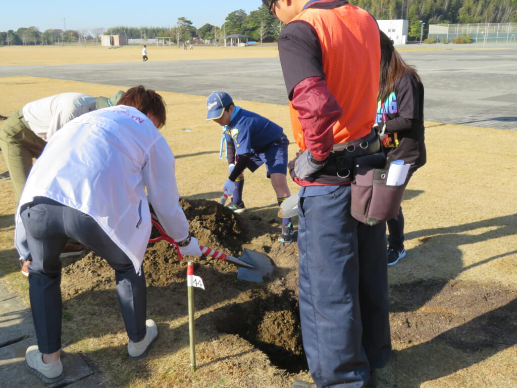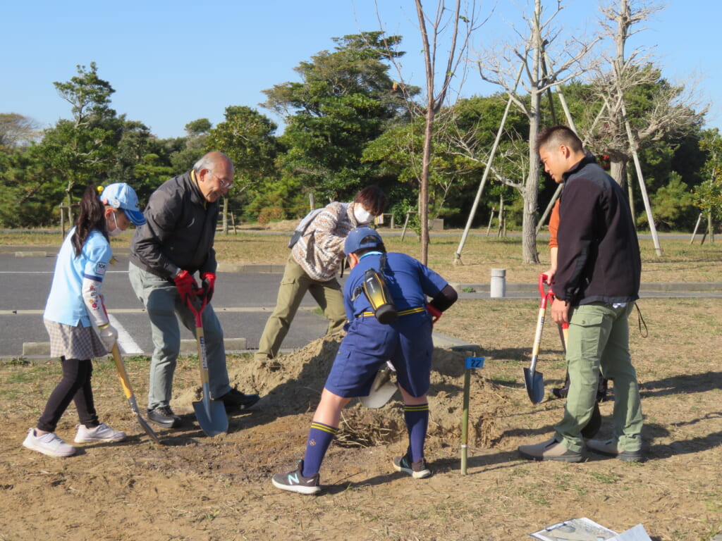 千葉県旭市の旭文化の杜公園は、敷地が10ヘクタールあり、芝生の広場や遊具のほかテニスコートなど幅広い年代の方が楽しめる公園です。この公園が地域の皆さまに親しまれ笑顔あふれるさくらの名所となることを祈念し、50本のさくらを旭市に寄贈し地域ボランティアの皆さまと植樹を実施しました。
