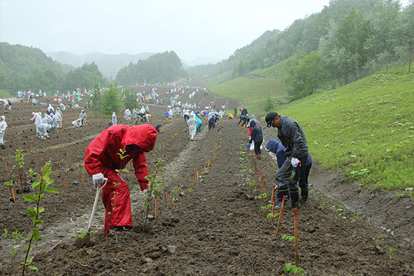 厚真町は森林が町域の7割を占めるみどり豊かな町で、町の中央部を流れる厚真川を中心に、美しい田園風景が広がっています。基幹産業である農業、とりわけ稲作に欠かせない水資源を安定的に確保するために、現在、水源涵養機能が著しく低下した厚真川の上流部に位置するレジャー施設跡地に植樹を行い、森林が本来持つ機能の回復をめざします。